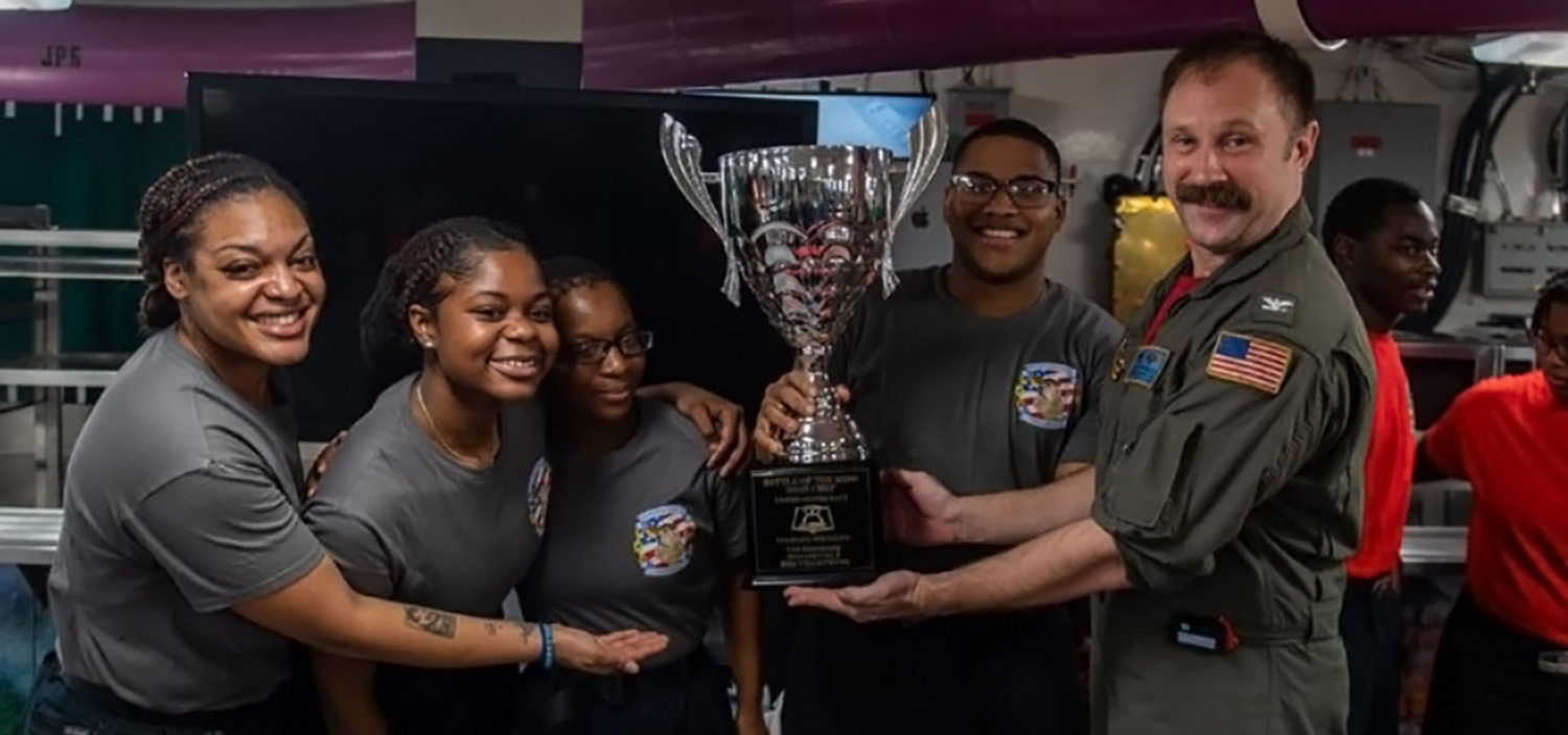 The winning team, from the forward galley, consisted of Culinary Specialist 2nd Class Sharia Morfin-Reynolds, Culinary Specialist Seaman Apprentice Destiny Aranda, Culinary Specialist Seaman Apprentice, and Culinary Specialist Seaman Apprentice Courtland Edwards.
